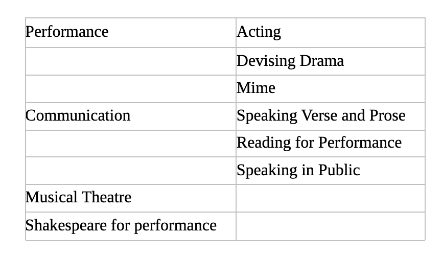 The examinations are divided into 2 separate syllabi, performance and communication. There are 2 extra subjects shakespeare for perfromance and musical theatre outside of the main 2 syllabus streams. The subjects verse and prose, reading for performance, speaking in public fall under the communication syllabus. Acting, devising drama and mime fall under the performance syllabus. LAMDA also offers a range of group examinations in these subjects.